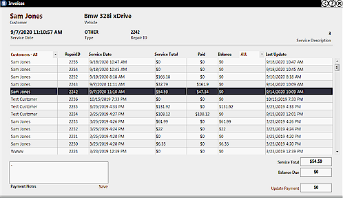 The Invoicing feature is a simple ledger keeping track of balances due. Here, you can email the invoice to the customer or print. This feature can be turned off if not needed.