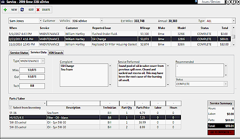By selecting the customer and vehicle, you can capture key information about the service. You can also add line items such as parts and labor. Items added from the Inventory selection will automatically adjust inventory levels.